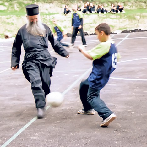 *на снимката: Един от най-обичаните и авторитетни православни йерарси днес – Черногорският митрополит Амфилохий Радович играе футбол с деца.