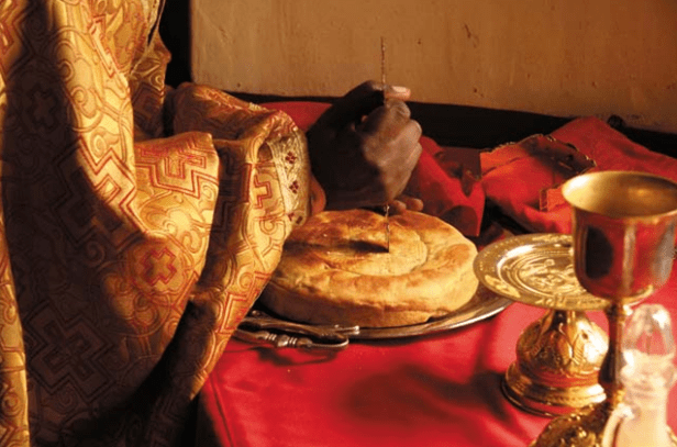 Проскомидия. От голяма просфора се изрязват частици. Една от тях е за всички православни християни по света.