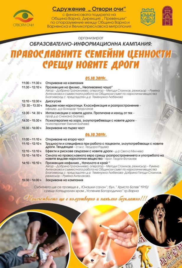 Сдружение „Отвори очи“ със съдействието на Община Варна, Дирекция „Превенции“ и Варненска и Великопреславска митрополия организират ежегодната си образователно – информационна кампания, която тази година ще протече под надслов: „Православните семейни ценности срещу новите дроги“. Кампанията ще се проведе на 5 и 6 октомври 2019 г. в Юнашкия салон срещу Катедралния храм „Св. Успение Богородично“.