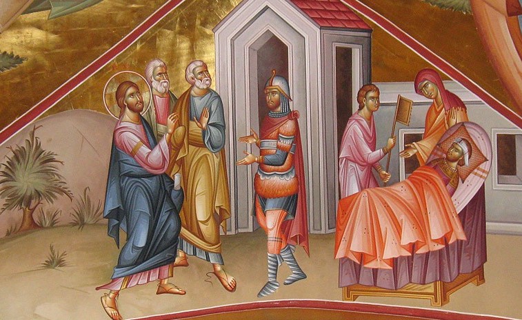 Днешното евангелско четиво от Мат. 8:5-13 трябва да се допълни с по-подробния в някои отношения разказ на Лука 7:1-10. Когато Спасителят слиза от планината на блаженствата в Капернаум, Той е посрещнат от група старейшини на местната синагога, която му предава молбата на един римски офицер стотник. Неговият любим слуга е смъртно болен. На пръв поглед може да се стори странно, че евреите, водачи на града, се ангажират с проблемите на един езичник. Този случай датира от ранния период на Христовото служение, когато Той все още не се сблъсква с омразата на тълпата, насъскана от книжниците и фарисеите. Старейшините обясняват на Иисус, че чужденецът не само не се подиграва с техните вярвания като мнозина други римляни, а влага спестяванията си, за да им построи разкошна синагога. За да направи такъв голям жест, няма съмнение, че по време на своята служба в Св. Земя той се заинтересува от вярата на поробените от Рим евреи, прочита Библията и възприема Яхве като свой Бог.